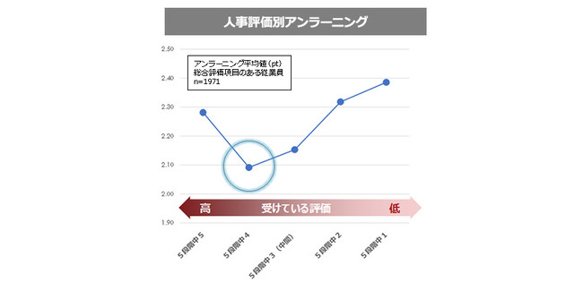 役職滞留年数とアンラーニングの関係を見ると、役職に就いて3ヶ月~半年未満でアンラーニングはピークに達し、その後減っていく傾向が見られた【図表10】。また、人事評価については、5段階中4の評価を受けている就業者が最もアンラーニングが低い【図表11】。