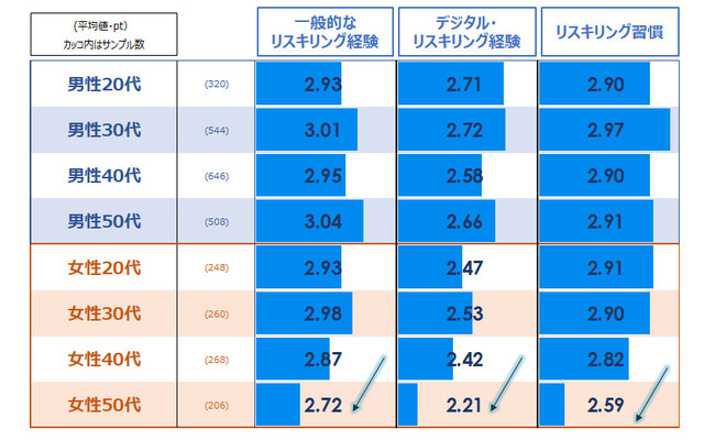 性年代別で見ると、女性の40~50代において、リスキリングの経験も習慣も大きく減少する傾向が見られた【図表4】。