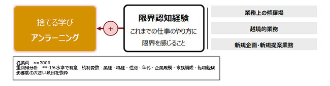 ひとつは、古いスキルや仕事のやり方を捨てていく「アンラーニング」の促進だ。「今のままでは成果を出せない」といった自身の仕事の「限界」を感じる機会がアンラーニングを促進する。逆に、受けている人事評価の「中途半端な高さ」はアンラーニングを抑制している傾向が見られた。