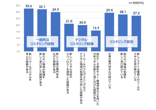 20~59歳の正社員3,000名を対象にリスキリングの実態を聞いた。新しいツールやスキル、知らない領域の知識などを学んだとする「一般的なリスキリング経験」のある人は3割前後、デジタル領域の新しい技術やデータ分析スキルなどを学んだとする「デジタル・リスキリング経験」のある人は2割程度である。また、日頃から知らない領域の知識を新たに学び続けたり、専門性を広げ続けたりしているといった「リスキリング習慣」がある人は3割弱となっている。