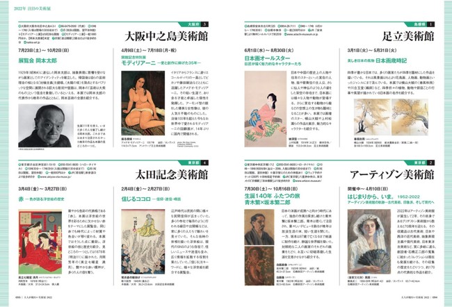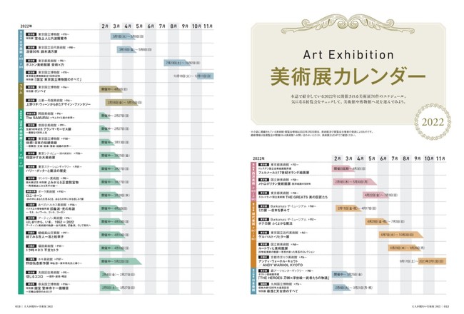 本誌で紹介している2022年に開催される美術展70軒のスケジュールを掲載。気になる展覧会をチェックして、美術館や博物館へ足を運んでみよう。