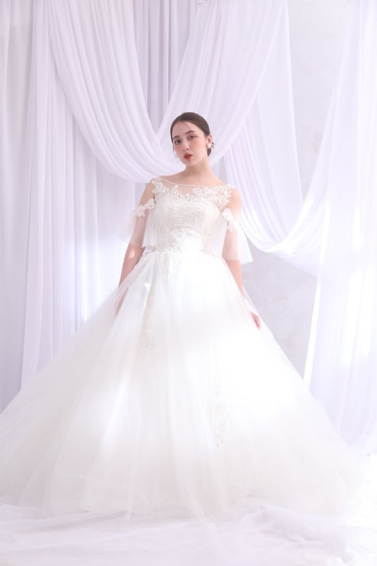 王道のウェディングドレス。肩の部分は取り外しが可能。シンプルな着こなしも