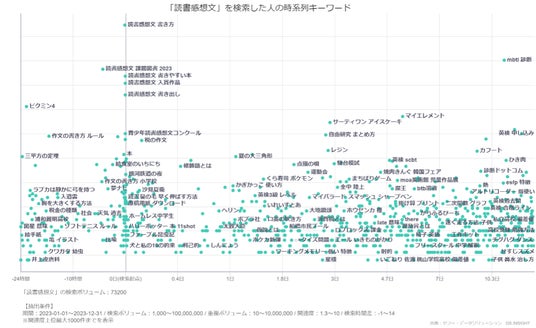 「ヤフー・データソリューション」が提供する分析ツール「DS.INSIGHT」を使用し、2023年の1年間を対象に、「夏休み 工作」「自由研究」「読書感想文」を検索した前後15日間の検索キーワードを分析しました。