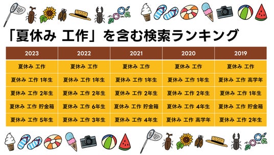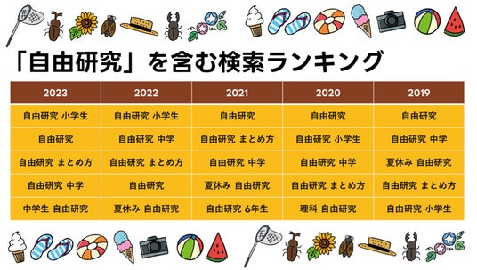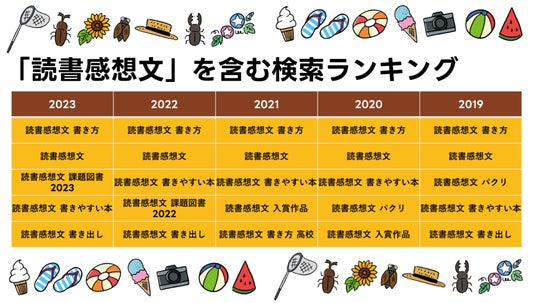 「夏休み 工作」については学年に合ったテーマが知りたいニーズがわかる結果となったのに対し、読書感想文は「読書感想文 書き方」が5年連続で1位となり、「書きやすい本」や「書き出し」というキーワードからも構成などに悩んでいる様子が見て取れる結果となりました。また自由研究では「まとめ方」が調べられており、こちらもどのように完成させればいいかという悩みがうかがえます。