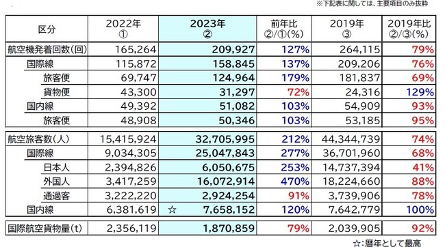 ●航空旅客数全体は、3,270万人(前年比212%、2019年比74%)となりました。