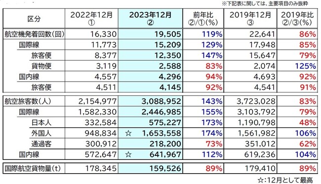 人(前年同月比174%、2019年同月比106%)で、12月としては最も高い値です。また、日本人旅客数は57万