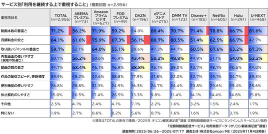 本レポートは、「2025年 オリコン顧客満足度(R)調査 定額制動画配信サービス」ランキングの調査期間:2025/06/26~2025/07/17の対象者2,956名に別途聴取したデータをまとめたものです。顧客満足度ランキングの詳細については、以下公式サイトのランキングページおよびランキングリリース資料PDFをご参照いただければ幸いです。