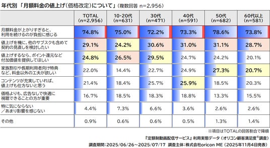 つづいて、『月額料金の値上げ(価格改定)について(複数回答)』聴取したところ、「月額料金が上がりすぎると、利用を続けるのが負担に感じる」が全ての年代で割合が最も高く7割以上に。次に、10・20代では「値上げするなら、ポイント還元など付加価値を提供してほしい」が26.5%で続き、30代・40代・50代・60代以上では「値上げを機に、他のサブスクも含めて契約の見直しを検討したい」が続きました。また、40代では「コンテンツが充実していれば、値上げも仕方ないと思う(25.9%)」が、50代と60代以上では「家族割引や長期利用者向け特典など、料金以外の工夫が欲しい」がそれぞれ3番目に続いています。