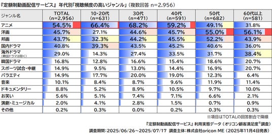 10~40代は「アニメ」、50~60代は「洋画」が最多に