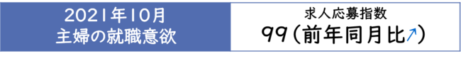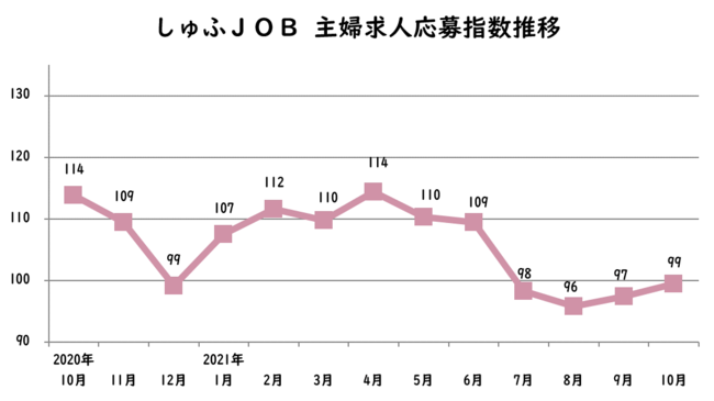 応募指数は4か月連続で100を下回った。7月、8月と求人数が大きく増加した一方で、応募数は緩やかな増加だったことが要因。今後、冬休みや年越し等で主婦層が忙しくなる12月に向けて、応募数は減少する傾向がある。求人数を維持したまま年明けを迎え、主婦の採用市場が活性化することを期待したい。