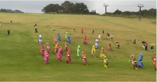 色とりどりの恐竜たちが秋風の中を疾走!「ティラノサウルスレース in スキージャム勝山」