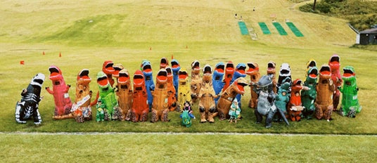 ティラノサウルスレースとは、ティラノサウルスの着ぐるみを着て競争する競技です。広場や体育館、競馬場、ビーチなど世界中の様々な場所で開催されており、そのコミカルな様子がSNS等でも人気で、世界中の人々に注目されています。