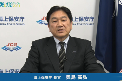 「海上保安庁は平和で豊かな海を守り、国民の安心安全を確保するため、様々な活動を行っています。合計で全国に約5,000箇所の航路標識を設置し管理をしています。以来、灯台は全国で、日々、海の安全を守るために重要な役割を担っております。灯台の設置は神奈川県横須賀に観音埼灯台を建設したことに始まります。昨年、航路標識法を改正し、航路標識協力団体制度を創設しました。本制度の活用が進むことは海上保安庁として灯台の管理や維持に大きく資するものと考えています。」(ビデオメッセージより)