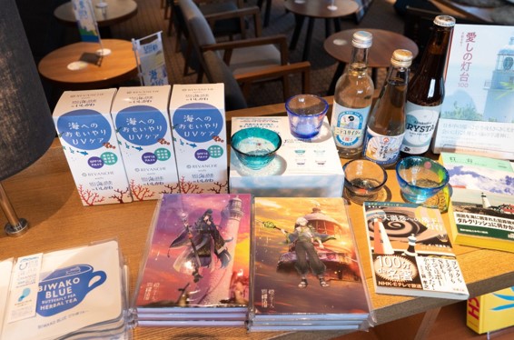 素肌にも海にもやさしい日焼け止め「海へのおもいやりUVケア」、燈の守り人「出雲日御碕灯台」御朱印帳、びわ湖ブルーティー、ニテコサイダーなど、各種オリジナル商品が展示紹介されました。