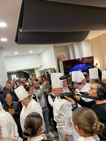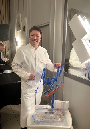 ・最終審査前日、2022年11月16日、パリから570キロ離れたグルノーブルへ自ら手配した食材や機材を搬入し、審査員に一つ一つ細かなチェックを受け、ついに最終審査を迎えます。審査では、2週間前に発表された課題を前菜、主菜、デザートの3品を各8皿、助手2名と5時間で創り上げます。