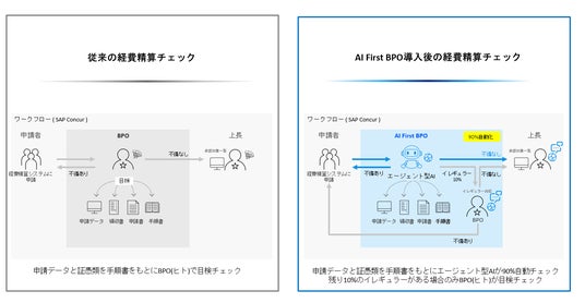 - AIと人による業務の高度化と最適化:エージェント型AIが経費精算の手順書を読み込み、必要な情報を集め、証憑や社内規定との整合などのチェック項目を自律的にタスク化します。その後、各ドメインのエージェント型AIが担当項目の確認作業を自動で実行するほか、経費精算システム「SAP Concur」のワークフローへの反映や、承認、不備を検知した差し戻し処理も自動で行います。経理担当者による確認が必要となる対応業務については、BPOの運用により、規定変更や運用改定が生じた際には速やかに手順書の整備などの最適化を図ります。こうしたAIとBPOの活用によって、人とAIによる業務の高度化を実現し、企業全体の業務最適化が可能になります。