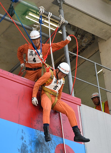 この日午前10時に訓練総見が開始。「ロープブリッジ救出」では、ロープにより素早く座席結びを作成した隊員2人がロープ・カラビナを携行して対面する塔上に進入し、要救助者を救出ロープに吊り下げ、牽引し救出作業を実施しました。また、「引揚救助」では隊員が空気呼吸器を装着後、塔下に降下し、検索により要救助者を発見。塔上の隊員に発見の合図を送った後、塔下に搬送した要救助者に縛帯を着装させ、隊員4人で協力して地上に救出したあと塔下の隊員はロープ登はんにより地上に脱出しました。訓練終了後、訓練を総括し、田中栄二消防長は「高槻市を代表する救助隊として、訓練成果を発揮し、全国大会への出場を勝ち取ってくれるものと信じています」と隊員たちを激励しました。