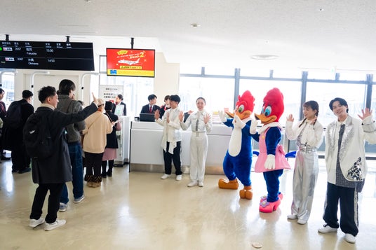その後、初便に搭乗する皆さまを搭乗口でウッディー・ウッドペッカーと、ウィニー・ウッドペッカーがご挨拶。福岡へ向かう「ドンキーコング・カントリー オープン記念 JAL×ユニバーサル・スタジオ・ジャパン ジェット 2」をご利用の96名(お子さま1名含む)を超元気にお見送りしました。