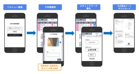 新機能では、購入者が自身のスマートフォンで2次元コードを読みとるだけで、内覧会での指摘事項や、リペア前とリペア後の写真を簡単に確認することができます。確認が完了すると、スマートフォンから署名を行い、控えとして内覧会シートをスマートフォンに保存することが可能です。内覧会における確認対応を購入者のスマートフォン上で完結することができ、内覧会シートのプリントアウトやメールでの送付といった従来の作業が不要となり、業務効率化と顧客満足度向上を同時に実現します。