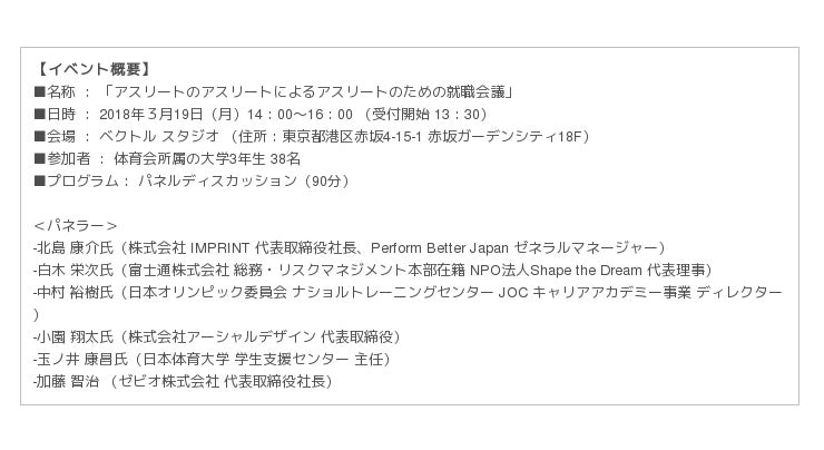 ゼビオ株式会社(本社:福島県郡山市、代表取締役社長:加藤智治)の属するゼビオグループは、就職活動真っ只中の体育会学生に対し、アスリートのキャリア全般について問題提起するとともに「ワークースポーツ バランス」というこれまでにない働き方を提唱する「アスリートのアスリートによるアスリートのための就職会議」を2018年3月19日(月)に開催いたしました。