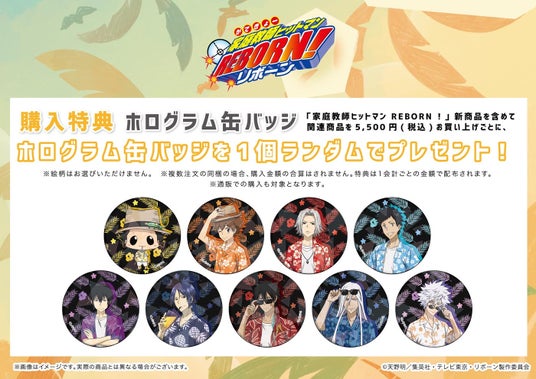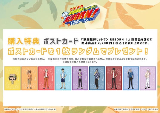 TVアニメ『家庭教師ヒットマンREBORN!』の新商品を含めて2,200円(税込)お買い上げごとにポストカード(全9種)をランダムで1枚、同じく新商品を含めて5,500円(税込)お買い上げごとにホログラム缶バッジ(全9種)をランダムで1個、それぞれプレゼントします!