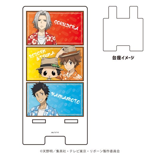 リボーンとツナ&獄寺&山本の4人、雲雀&骸の2人、XANXUS&スクアーロ&白蘭の3人がそれぞれデザインされた、15cm×7cmのアクリル製スマホスタンド「スマキャラスタンド」も登場。