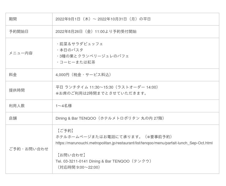 ホテルメトロポリタン 丸の内(所在地/千代田区丸の内、総支配人/蓮見秀樹)のダイニング&バー「テンクウ」では、9月と10月の平日限定で栗のパフェが付いたランチセットを販売いたします。