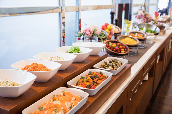 お食事にはテンクウ定番の「前菜&サラダビュッフェ」とパスタをご用意し、食後は産地の異なる3種類の栗と、甘酸っぱいクランベリージュレを重ね合わせたパフェをお楽しみいただけます。