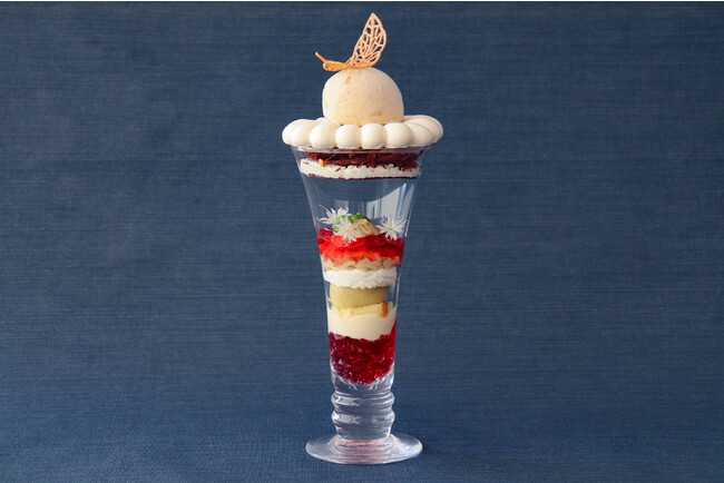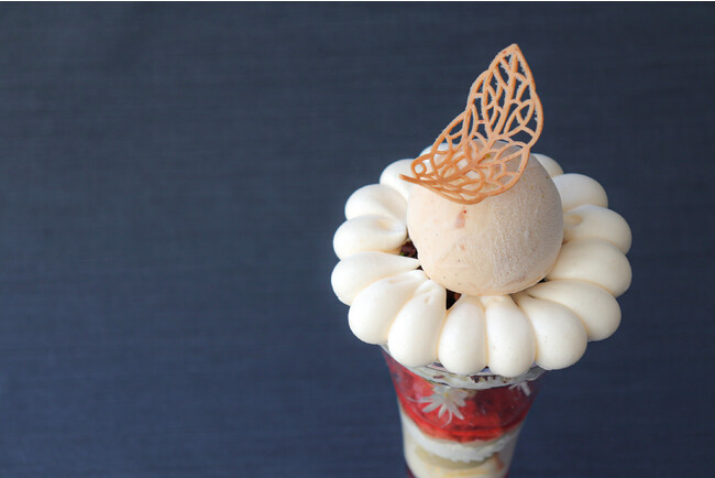 産地の異なる和栗と西洋栗を組み合わせ、風味に変化をつけたパフェにしました。上層部分は栗のアイスクリームと渋皮煮、アーモンドのキャラメリゼを使用し、栗のやわらかな香ばしさとまったりとした甘みをお楽しみいただけます。下層部分は栗のペーストをクランベリーのジュレとオレンジの香るクリームでサンドし、フルーツの酸味と香りを用いたすっきりとした味わいに仕上げております。栗の風味の変化を味わった後はすべて混ぜていただき、香ばしさと酸味の調和をご堪能ください。