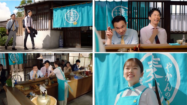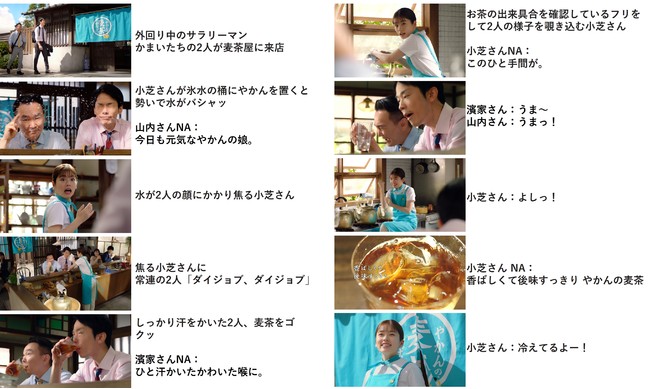 外回り中のサラリーマンに扮するかまいたちの二人が麦茶屋に来店し、大きなやかんを運ぶ小芝さんの「いらっしゃい!」という元気な呼びかけでCMがスタート。小芝さんがやかんを桶に置いたときに跳ねた水が、かまいたちの二人の顔に跳ねるハプニングにも見舞われますが、最後はやかんでじっくり煮出して、きゅ~っと冷やして“ひと手間”かけた麦茶を飲んだかまいたちの二人が、満足そうに「うまっ!」と喉をうるおします。お客さんが喜んでいる様子を見て、店主の小芝さんも思わずガッツポーズ。