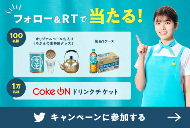 「やかんの麦茶」公式Twitterアカウントをフォローし、キャンペーンの告知投稿をリツイート(RT)していただいくと、オリジナルペール缶入り「やかんの麦茶屋グッズ」と製品1ケースや、Coke ONドリンクチケットをプレゼントするTwitterキャンペーンを実施します。
