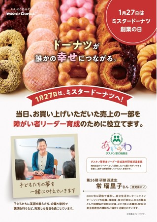毎年1月27日にミスタードーナツ店舗でお買い上げいただいた金額の一部を障がいのある方の自立と社会参加を支援する「ダスキン愛の輪基金※1」に寄付させていただきます。