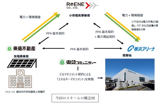 株式会社横浜アリーナ(本社:神奈川県横浜市、代表取締役社長:村井 宏通、以下「横浜アリーナ社」)は、横浜市内の多目的施設「横浜アリーナ(所在地:神奈川県横浜市港北区、以下「横浜アリーナ」)」において、東急不動産株式会社(本社:東京都渋谷区、代表取締役社長:田中 辰明、以下「東急不動産」)が横浜市立の学校屋上に設置する太陽光発電設備由来の再エネ電力を、東急不動産100%出資子会社の株式会社リエネ(本社:東京都渋谷区、代表取締役:西田 恵介、以下「リエネ社」)を介して、オフサイト型コーポレートPPA(以下「オフサイトPPA」)※1スキームにて供給を受け、同施設の使用電力の一部として活用する取り組み(以下「本取り組み」)を、2026年4月より開始したことをお知らせいたします。本取り組みにより、横浜市内で生まれた再生可能エネルギー(以下、「再エネ電力」)を横浜市内で有効活用する「地産地消」を構築し、横浜市の脱炭素社会の実現へ貢献してまいります。また、横浜アリーナのビルマネジメントを請け負う株式会社東急コミュニティー(本社:東京都世田谷区、代表取締役社長:速川 智行、以下「東急コミュニティー」)は、建物の維持管理において、今回導入するオフサイトPPAに加えた、リエネ社からの電力供給に対しても適切なエネルギー管理を行うことで、更なる建物価値の向上を図ります。