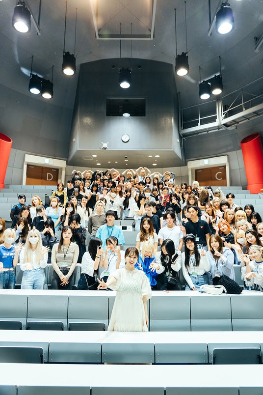 「タレントとして活動するのも、起業家として活動するにも、とにかく個人戦ではなく“チーム戦”で、そういう仲間をつくることが本当に大事だと実感しています。大阪モード学園には、ファッションだけじゃなくて、メイクもヘアも、グラフィックもあって、SNSを活用する授業もあるって聞きました。そういう環境で、特にファッションも、メイクとつなげて考えるのが大事だと思うし、色々なつながりができるのは本当に良いと思います。私はこういう環境で学ぶことができなかったけど、きっと学ぶ中で競争もあるだろうし、失敗とか、悔しい気持ちを次につなげながら学ぶことができる環境はうらやましいと思います。」