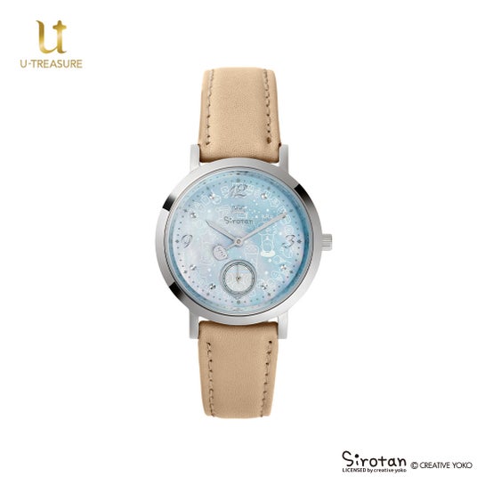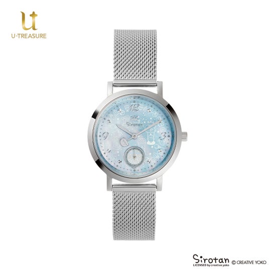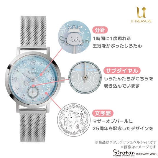 このたびの新作は、しろたんの25周年を記念したアニバーサリーウォッチ(腕時計)です。文字盤にはマザーオブパールを贅沢に使用し、しろたんの可愛さを詰め込んだデザインです。ベルトは全4種類の中からお選びいただけます。