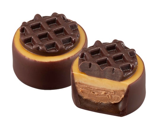 ベルギースイーツを代表するリエージュシロップをたっぷりかけた、チョコレートワッフルをイメージしたチョコレートです。ベルギー伝統の洋ナシとリンゴ風味のリエージュシロップにクランブルが入ったアーモンドプラリネを重ね、ダークチョコレートで包み、リエージュワッフル形のダークチョコレートを飾りました。ベルギースイーツには欠かせないひと粒です。
