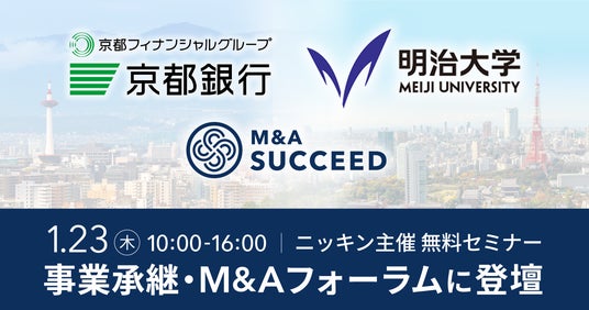 Visionalグループの株式会社M&Aサクシード(所在地:東京都渋谷区/代表取締役社長:金 蓮実)が運営する法人限定M&Aプラットフォーム「M&Aサクシード」(https://ma-succeed.jp/)は、日本金融通信社(以下、ニッキン)が主催する「事業承継・M&Aフォーラム 2025」(2025年1月23日)に登壇することをお知らせします。