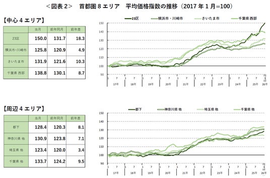 なお、東京都(23区/都下)、さいたま市、千葉県他の4エリアは2017年1月以降最高額を更新した。