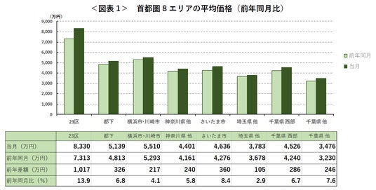 首都圏全体の平均価格は、前月比で6カ月ぶりに下落したものの、前年同月比は17カ月連続で上昇した。