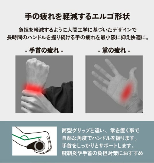 エルゴノミクス形状により、手のひらや指への圧力を分散し、疲れを軽減します。