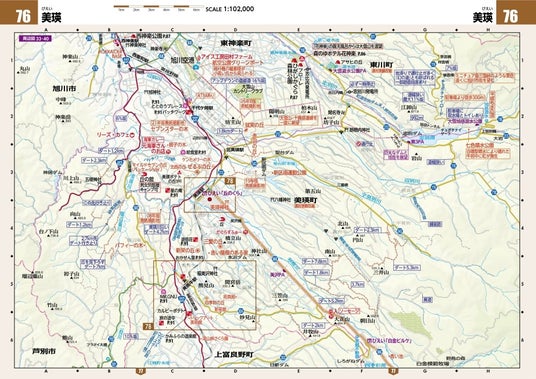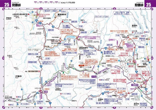 その広大さから本図の縮尺が他エリアより小さい20万分の1(R版は17万分の1)となる北海道版。北海道ツーリングをさらに応援すべく、今回16ページ分、80カ所以上の拡大図を一挙増強しました!