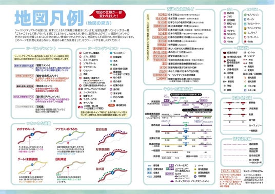 例年同様、取材担当ライダーによる実走取材やモニター情報などを元に、コメント情報を更新しています。また昭文社の持つ地図情報や、各種取材網を駆使し、膨大な数の道路や施設の経年情報(開通・開業・閉鎖・移転等)にも対応しています。絶景・快走路・ワインディング・ダートなどの道路コメントから、温泉・道の駅・グルメ・名水・歴史スポット・ダム・キャンプ場など様々なジャンルへのコメントが今年も新たに追加・修正されています。