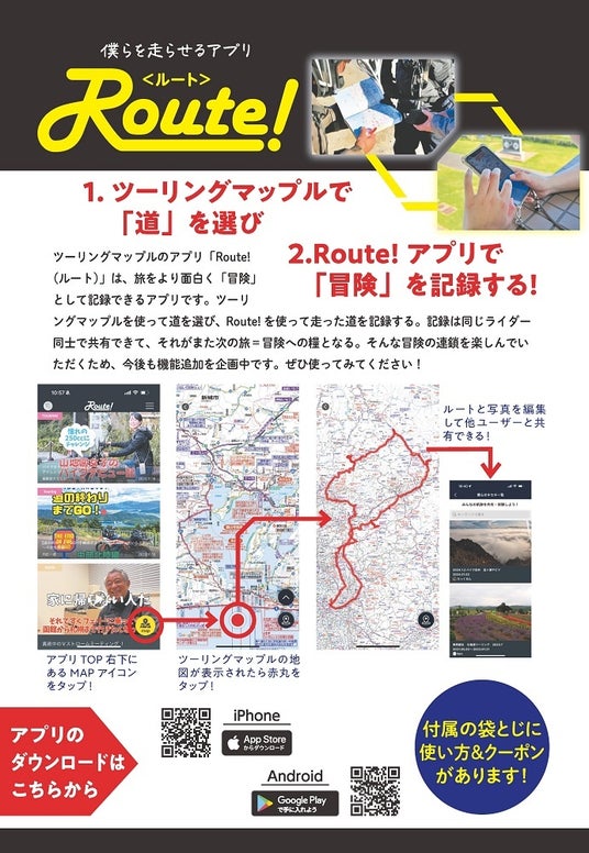 ツーリングマップルがスマホで見られるアプリ「Route!(ルート)」は、継ぎ目なく地図を見ることができ、自位置の表示や、走行ログを記録することもできます。プランニング時は書籍でパラパラと、出先ではアプリで現在地を確認しながら、というような併用が大変便利です。