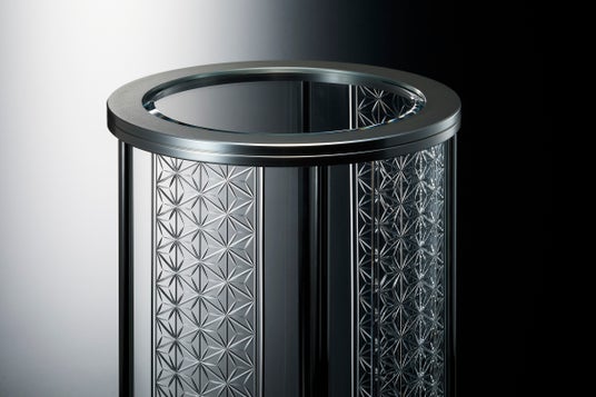 円柱形のガラスケースに大胆に施した、吉祥文様の「麻の葉」柄