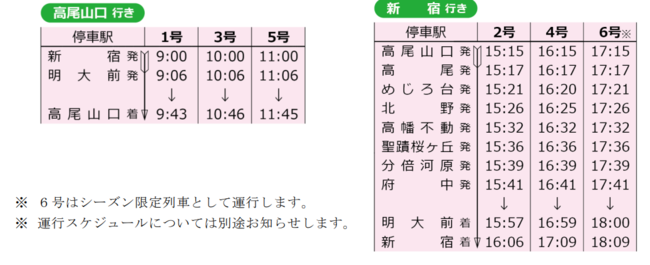 「Mt.TAKAO号」は、2018年11月から臨時座席指定列車として運行を開始し、車内で快適にお過ごしいただける列車としてお客様にご好評いただき、今回のダイヤ改正にあわせ通年運行化します。