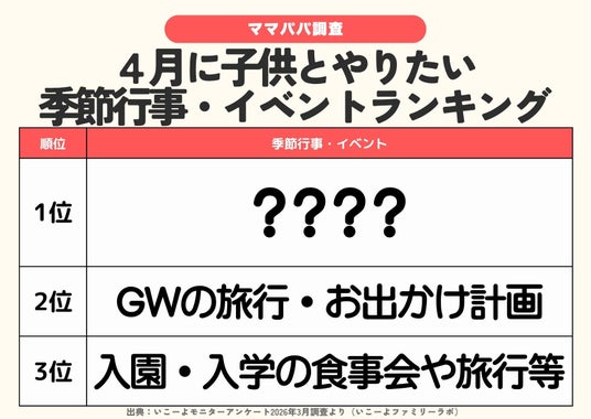 国内最大級の子どもとお出かけ情報サイト「いこーよ」を運営するアクトインディ株式会社(本社:東京都品川区、代表取締役:下元敬道)は、子育て層のリアルな動向を探る「いこーよファミリーラボ」にて子育て世帯に、「4月の季節行事・イベント」についてアンケート調査を実施しました。