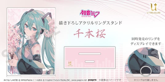 株式会社ユートレジャー(本社:東京都新宿区、代表取締役:伊藤 崇史)は、クリプトン・フューチャー・メディア株式会社(本社:北海道札幌市、代表取締役:伊藤博之)とのコラボレーションアイテムとして、黒うさP様の人気楽曲「千本桜」モチーフリングを身に付けた初音ミクの描き下ろしアクリルリングスタンドを2024年9月10日(火)~10月24日(木)の期間限定で予約受け付けを行います。