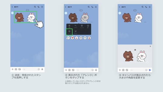 スタンプを組み合わせて送ることができる「スタンプアレンジ機能」では送信・受信したスタンプを元に編集して送信可能に