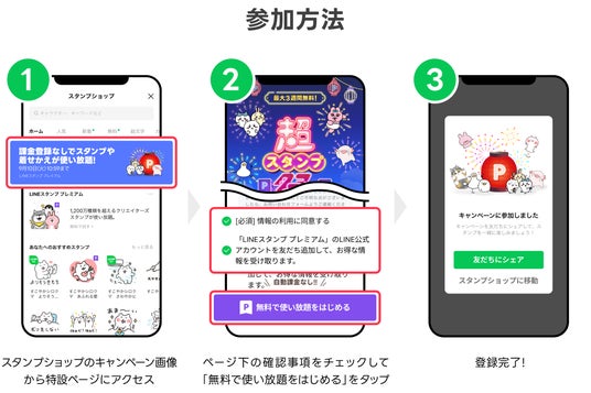 「超スタンプ祭」には特設サイトから参加することができ、参加する際にお支払い方法の登録は不要で「超スタンプ祭」の期間終了後は「超スタンプ祭」への参加前の状態に戻るため、自動で課金されることなく対象スタンプ・絵文字・着せかえの使い放題を楽しむことができます。※3
