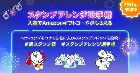 LINEスタンプ公式Xでスタンプアレンジの達人を決める「#スタンプアレンジ選手権」も開催中で、「かわいすぎるで賞」「エモい!夏の思い出で賞」「圧がすごいで賞」の3つのお題のうち好きなお題に対して、お気に入りのスタンプアレンジを投稿したユーザーの中から最優秀賞と優秀賞が選ばれるユーザー参加型のキャンペーンとなります。お題ごとに1名ずつの最優秀賞受賞者と4名ずつの優秀賞受賞者が選ばれ、合計3名の最優秀賞受賞者にはそれぞれ10,000円、合計12名の優秀賞受賞者にはそれぞれ3,000円のAmazonギフト券をプレゼントします。
